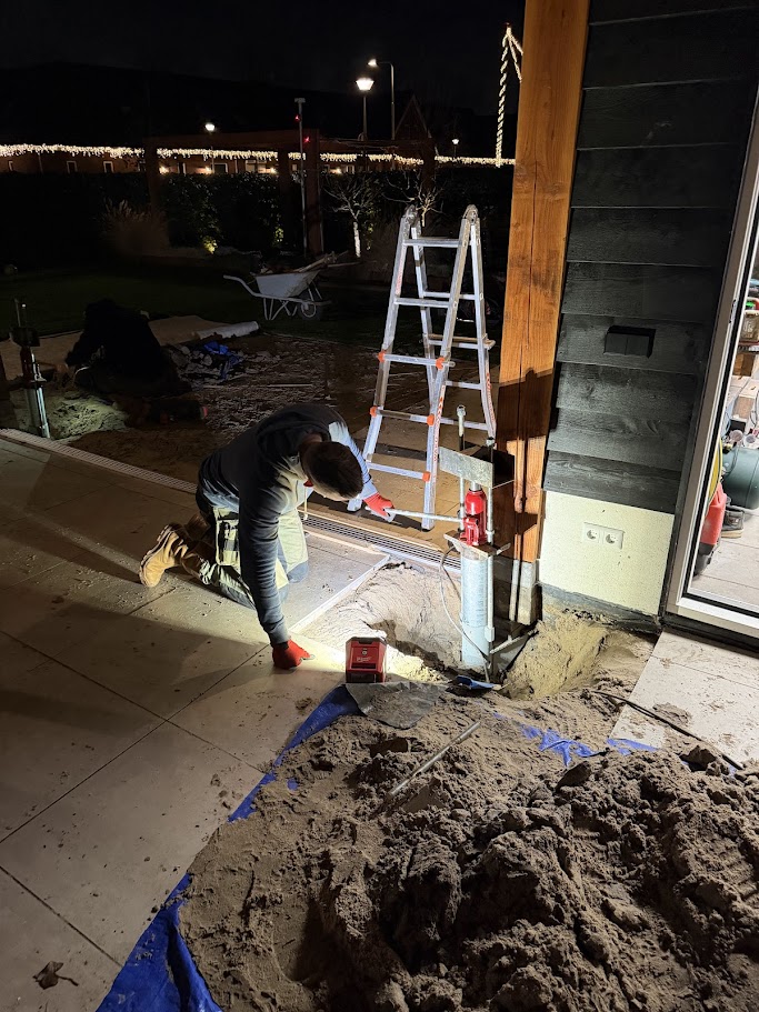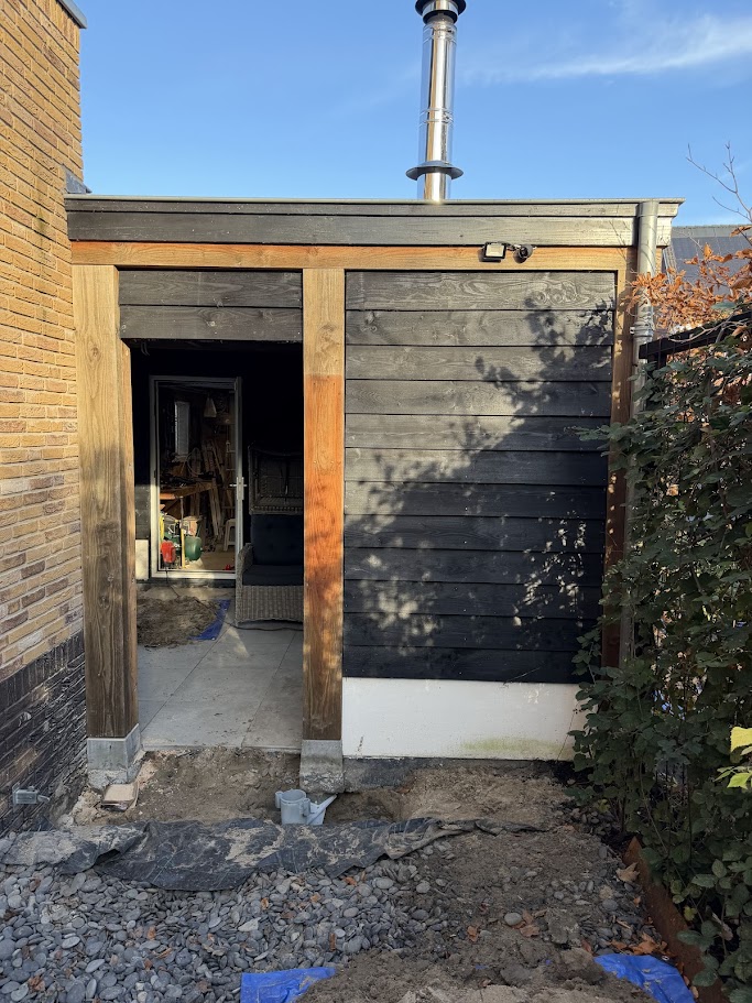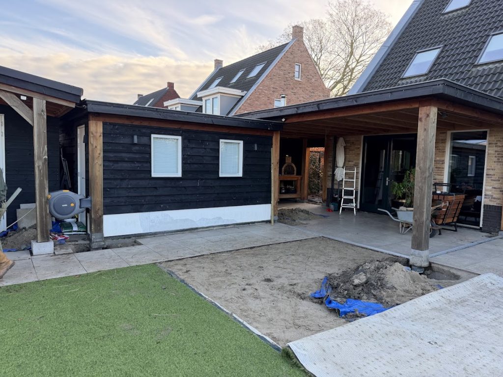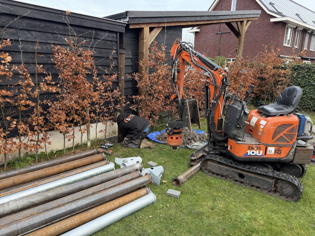 Deze verzakte overkapping en schuur in Ridderkerk hebben we doormiddel van schroefpalen weer netjes recht gevijzeld. De constructie was op meerdere punten verzakt en het water op het dak liep niet meer netjes via de HWA weg. Gelukkig hebben we dit probleem met het rechtzetten verholpen en kan kunnen deze overkapping en schuur er weer jaren tegen aan!